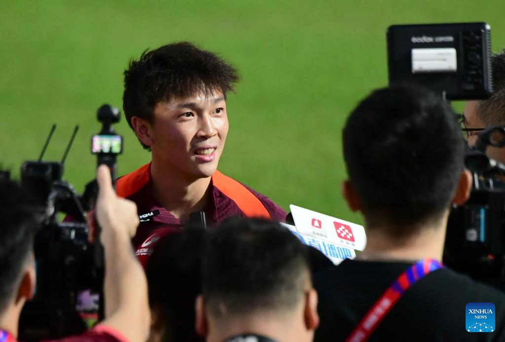 Wang Zhen'ao of the Chinese national men's football team is interviewed during a training session for the upcoming 2026 FIFA World Cup Asian Qualifiers match between China and Japan in Xiamen, east China's Fujian Province, Nov. 17, 2024. (Xinhua/Wei Peiquan)