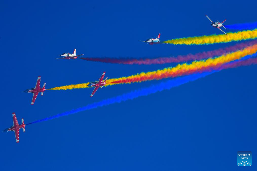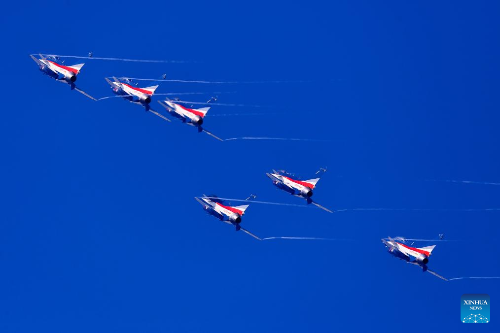 Aircraft of the Bayi Aerobatic Team of the Chinese People's Liberation Army Air Force conduct adaptive training in Zhuhai, south China's Guangdong Province, Nov. 8, 2024. The 15th China International Aviation and Aerospace Exhibition, also known as Airshow China, was held in Zhuhai from Nov. 12 to 17. (Photo by Xu Yang/Xinhua)