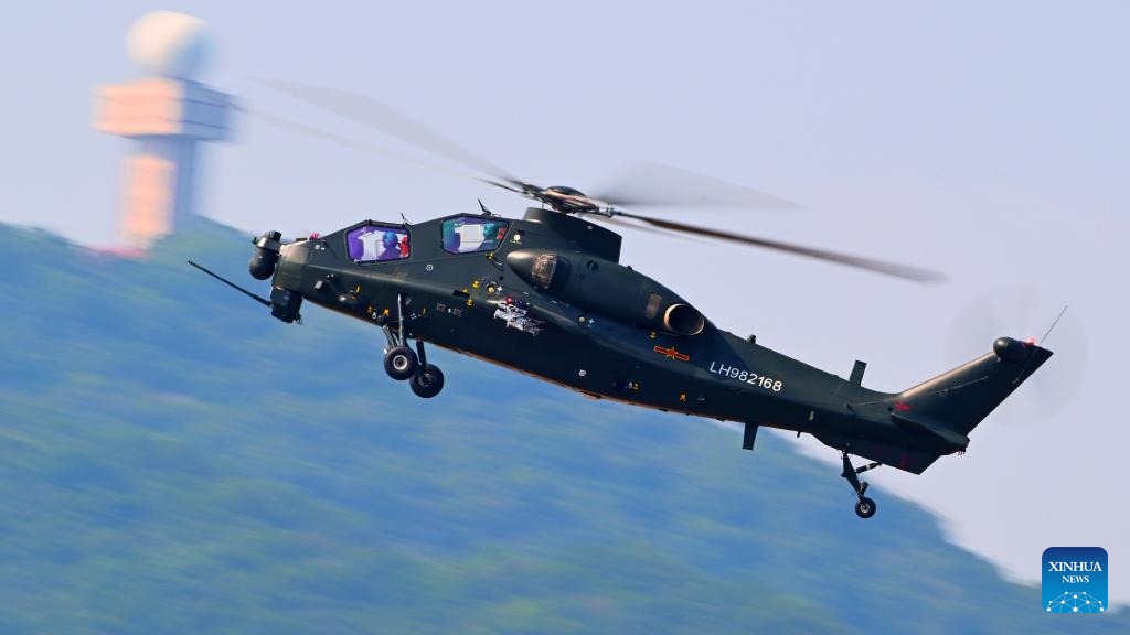 A helicopter of the Chinese People's Liberation Army (PLA) takes part in a performance during Airshow China in Zhuhai, south China's Guangdong Province, Nov. 12, 2024. The 15th China International Aviation and Aerospace Exhibition, also known as Airshow China, was held in Zhuhai from Nov. 12 to 17. (Photo by Xu Yang/Xinhua)