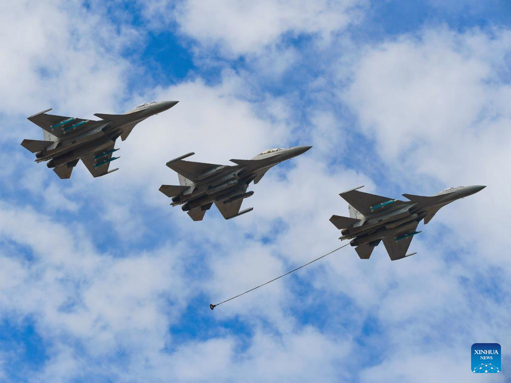 China's J-15 carrier-based fighter jets conduct adaptive training in Zhuhai, south China's Guangdong Province, Nov. 9, 2024. The 15th China International Aviation and Aerospace Exhibition, also known as Airshow China, was held in Zhuhai from Nov. 12 to 17. (Photo by Xu Yang/Xinhua)