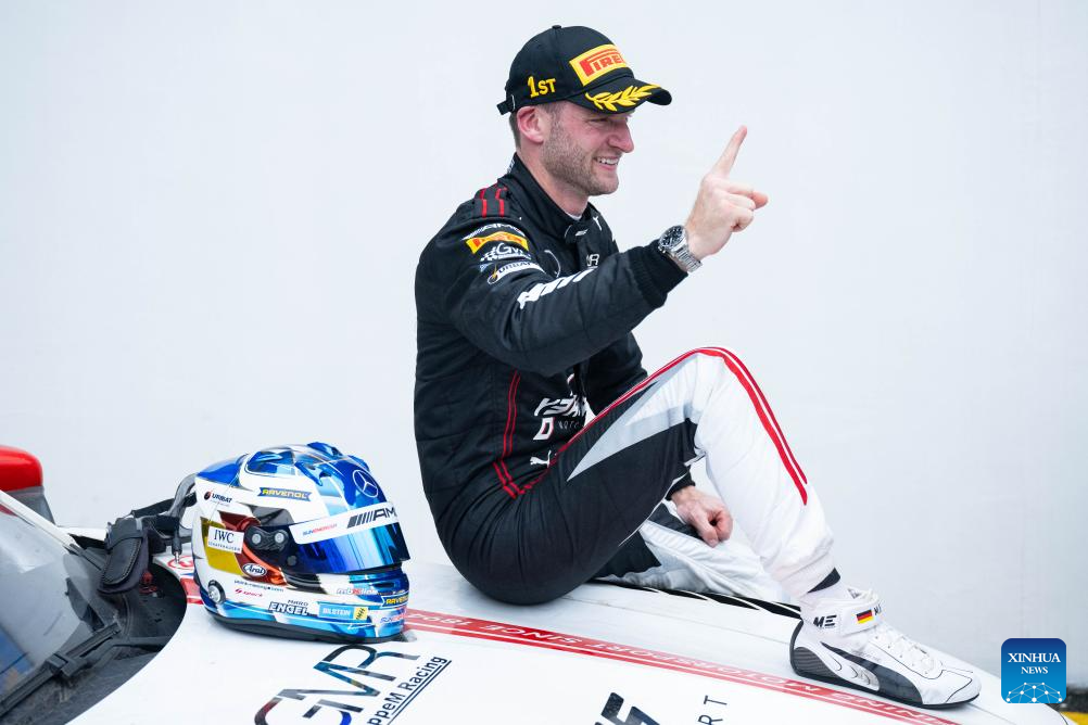 Maro Engel (C) of Germany reacts after the Macao GT Cup-FIA GT World Cup race at the 71st Macao Grand Prix in Macao, south China, Nov. 17, 2024. (Xinhua/Cheong Kam Ka)