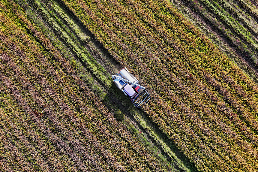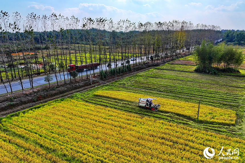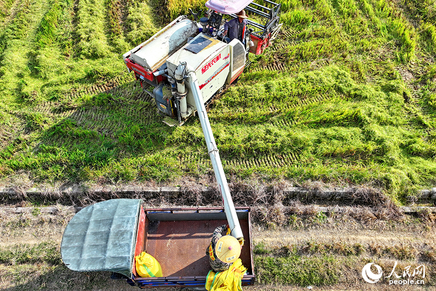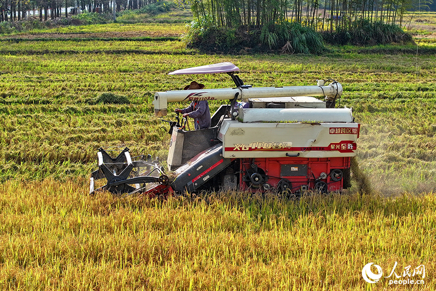 Recently, in Huangping village, Yifeng county, east China's Jiangxi Province, villagers used harvesters to gather late rice in high-standard farmland.