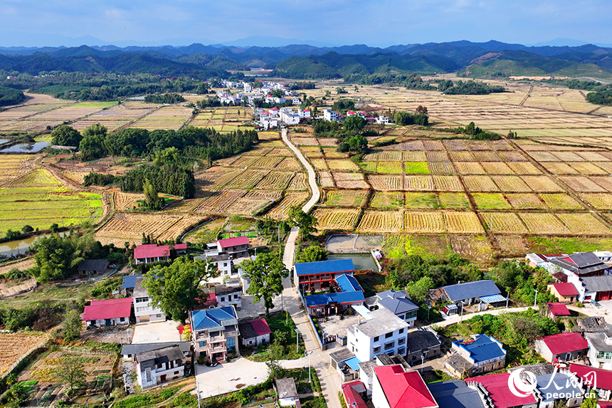 In Huangping village, Chengtang township, Yifeng county, Yichun city, east China's Jiangxi Province, contiguous high-standard farmland stretches across the area, interwoven with residential houses, creating a picturesque scene. (People's Daily Online/Zhu Haipeng)