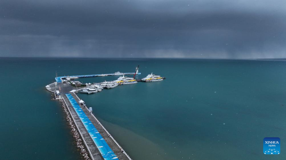 An aerial drone photo taken on Nov. 18, 2024 shows a dock for tourist boating service in Qinghai Lake in northwest China's Qinghai Province. (Xinhua/Zhang Long)