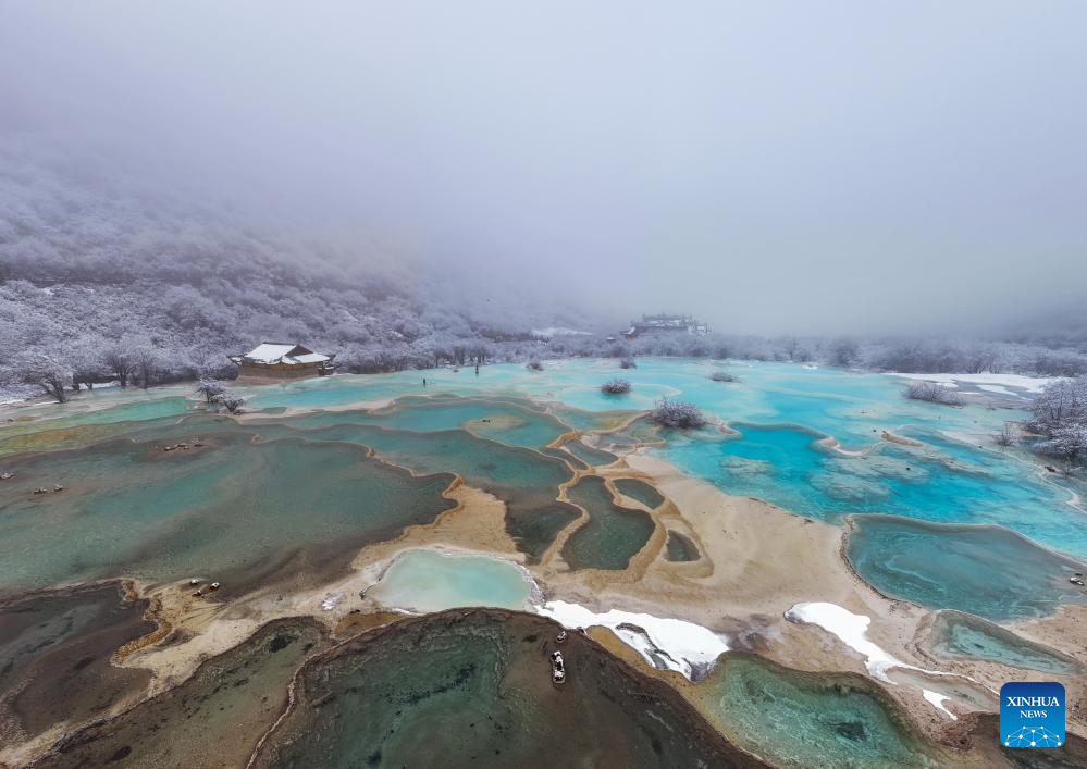 An aerial drone photo taken on Nov. 18, 2024 shows a view of a colorful pond cluster at Huanglong scenic area after snow in Tibetan-Qiang Autonomous Prefecture, southwest China's Sichuan Province. (Xinhua/Wang Xi)