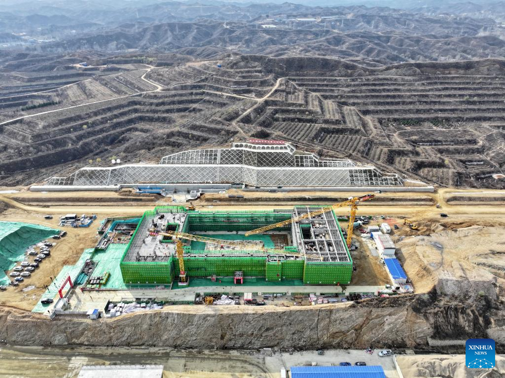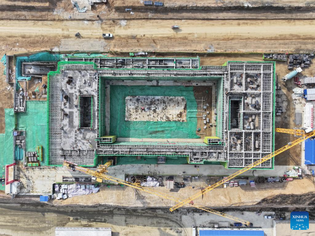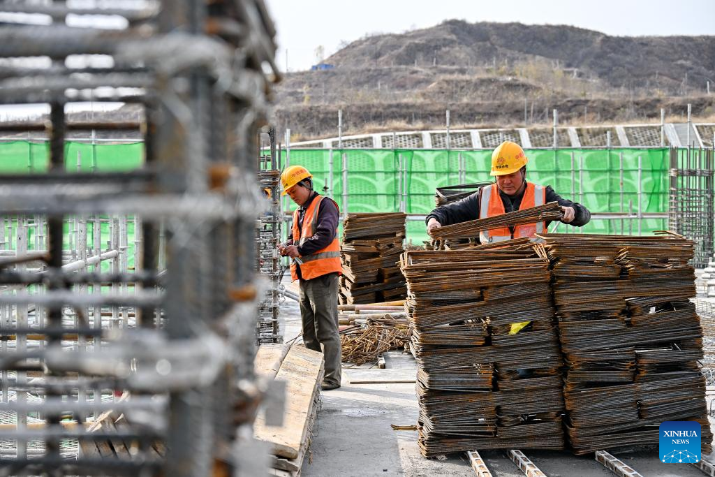 People work at the construction site of Fuping Railway Station of the Xiong'an-Xinzhou High-speed Railway in north China's Hebei Province, Nov. 18, 2024. The construction of the main structure of Fuping Railway Station was capped on Monday, which is now followed by steel structure installation.