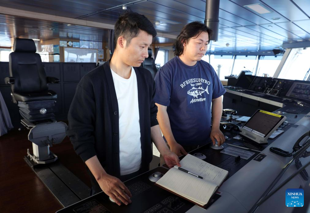First mate Zhu Pengtao (L) and sailor Chen Dongbin adjust the navigation course aboard China's research icebreaker Xuelong 2. Currently on China's 41st Antarctic expedition, research icebreakers Xuelong and Xuelong 2, or Snow Dragon and Snow Dragon 2, will begin to plough through the belt of prevailing westerlies, nicknamed the "rolling forties," on Tuesday. (Xinhua/Huang Taoming)