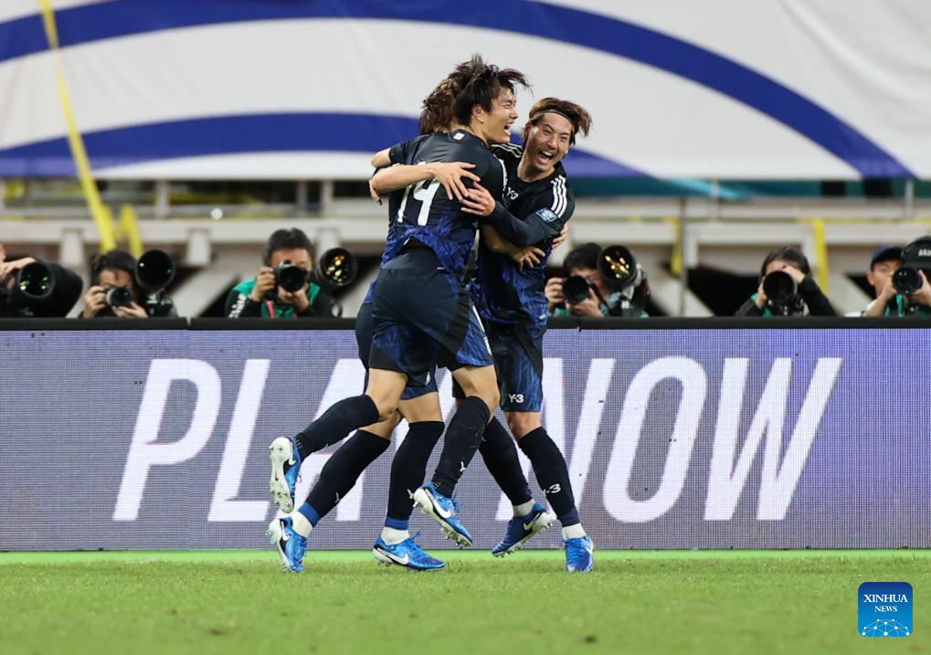 Players of Japan celebrate their second goal during the 2026 FIFA World Cup Asian Qualifier match between China and Japan in Xiamen, southeast China's Fujian Province, Nov. 19, 2024. (Xinhua/Jia Haocheng)