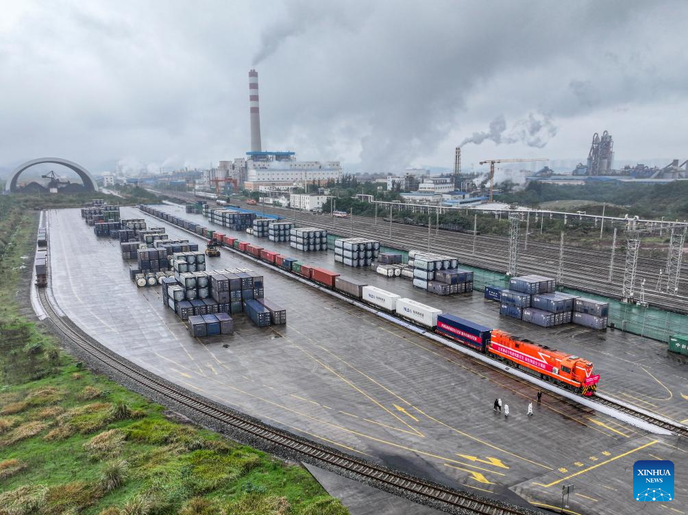 A train loaded with lithium batteries for traction purposes is about to depart from Yibin Port in Yibin, southwest China's Sichuan Province, Nov. 19, 2024. Three trains loaded with lithium batteries for traction purposes departed separately from Chongqing, Guiyang and Yibin on Tuesday, marking the first large scale test run for rail transportation of such batteries in China.