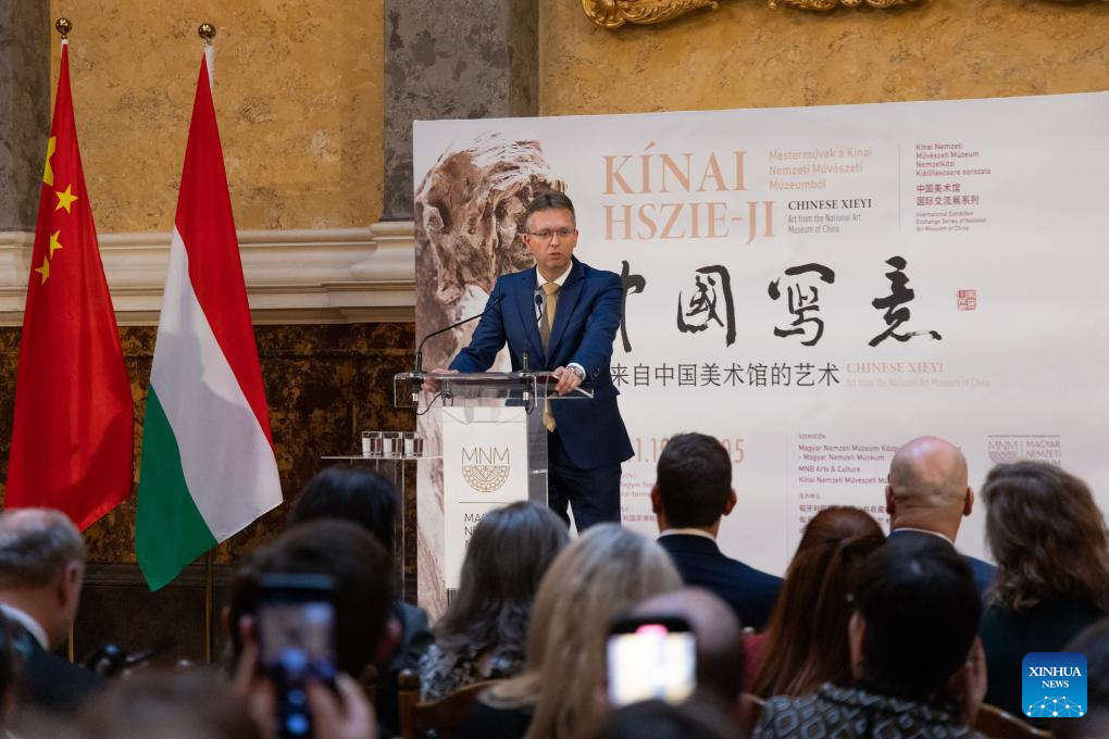 Balazs Hanko, Hungarian minister for culture and innovation, speaks at the opening ceremony of the exhibition "Chinese Xieyi - Art from the National Art Museum of China" in Budapest, Hungary, on Nov. 19, 2024. The Hungarian National Museum in Budapest inaugurated on Tuesday the exhibition "Chinese Xieyi - Art from the National Art Museum of China," as part of the celebration of the 75th anniversary of diplomatic relations between Hungary and China. (Photo by Attila Volgyi/Xinhua)