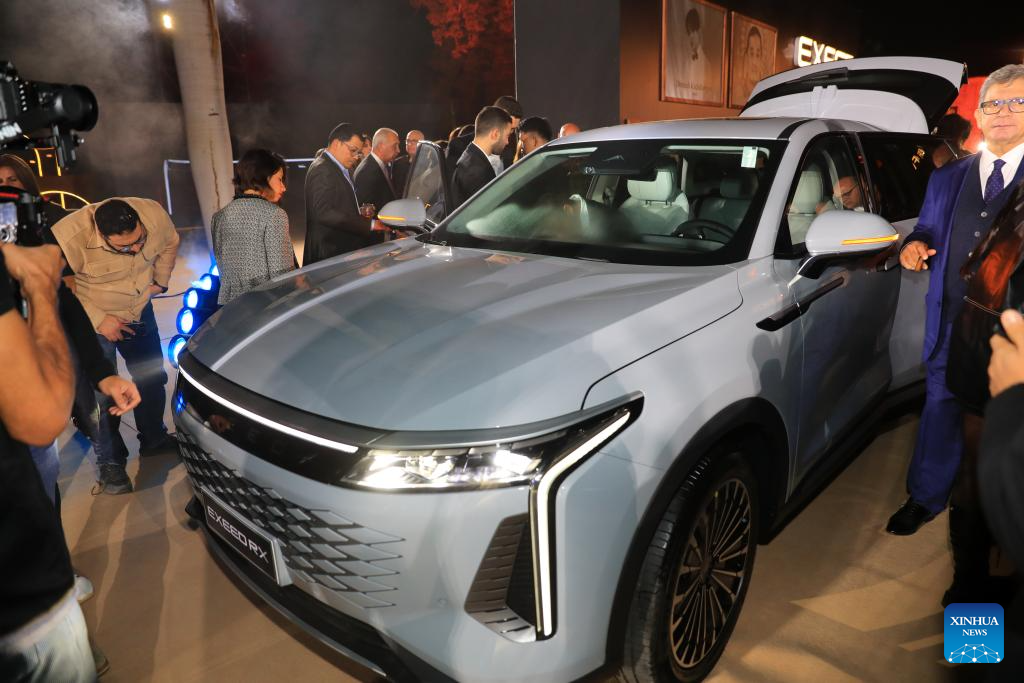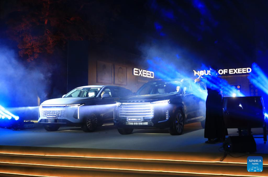People attend a launching ceremony of two Exeed SUV models in northern Great Cairo, Egypt, on Nov. 18, 2024. Chinese premium automotive brand Exeed, a subsidiary of automaker Chery, has introduced two SUV models, the Exeed RX and Exeed VX, to the Egyptian market. (Xinhua/Sui Xiankai)