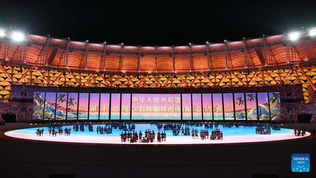 This photo taken on Nov. 22, 2024 shows the opening ceremony of the 12th National Traditional Games of Ethnic Minorities of the People's Republic of China in Sanya, south China's Hainan Province. (Xinhua/Yang Guanyu)