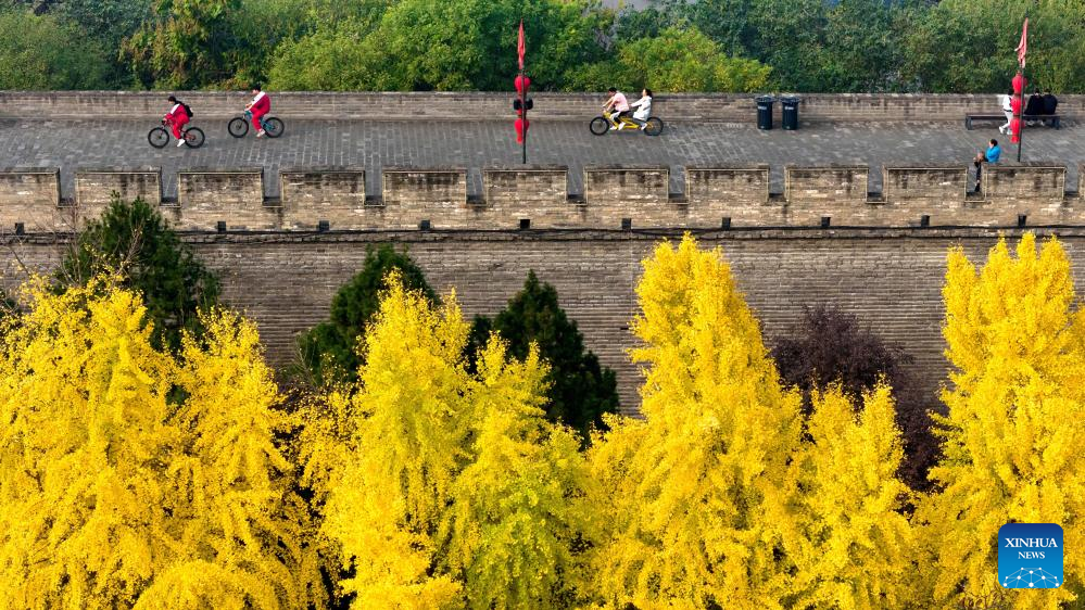 A drone photo shows tourists riding on the ancient city wall in Xi'an, northwest China's Shaanxi Province, Nov. 10, 2024 (Xinhua/Zou Jingyi)