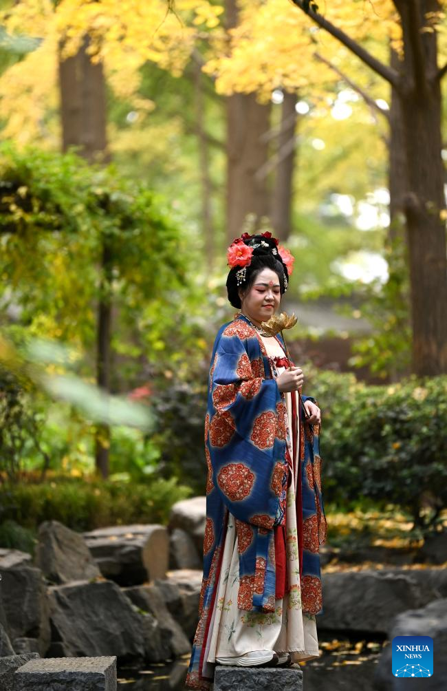 A tourist in traditional Chinese costumes poses for photos at the Yannan Park in Xi'an, northwest China's Shaanxi Province, Oct. 18, 2024. (Xinhua/Zou Jingyi)
