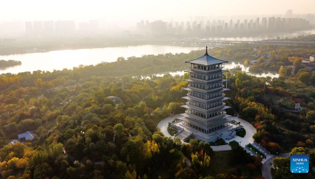 An aerial drone photo taken on Nov. 5, 2024 shows the scenery at the Xi'an Expo Park in Xi'an, northwest China's Shaanxi Province. (Xinhua/Zou Jingyi)