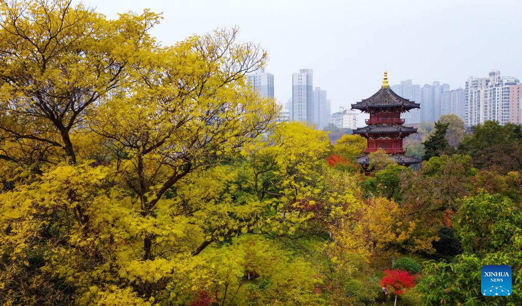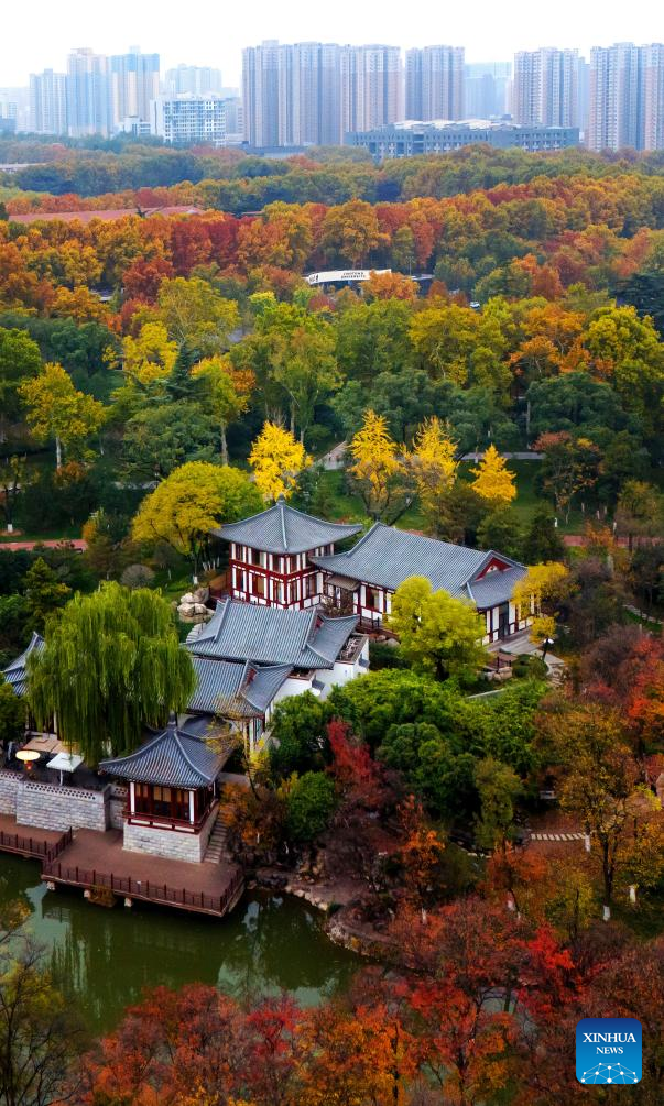 An aerial drone photo taken on Nov. 14, 2024 shows the scenery at the Xingqing Palace Park in Xi'an, northwest China's Shaanxi Province. (Xinhua/Zou Jingyi)
