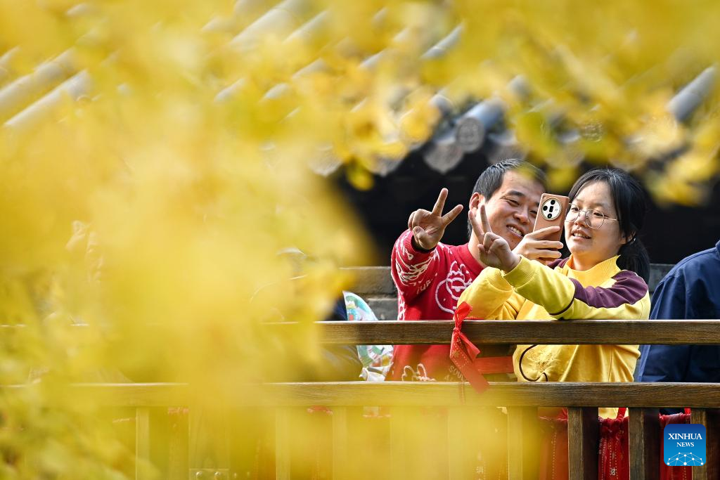 Tourists take photos at a temple in Xi'an, northwest China's Shaanxi Province, Nov. 6, 2024. (Xinhua/Zou Jingyi)