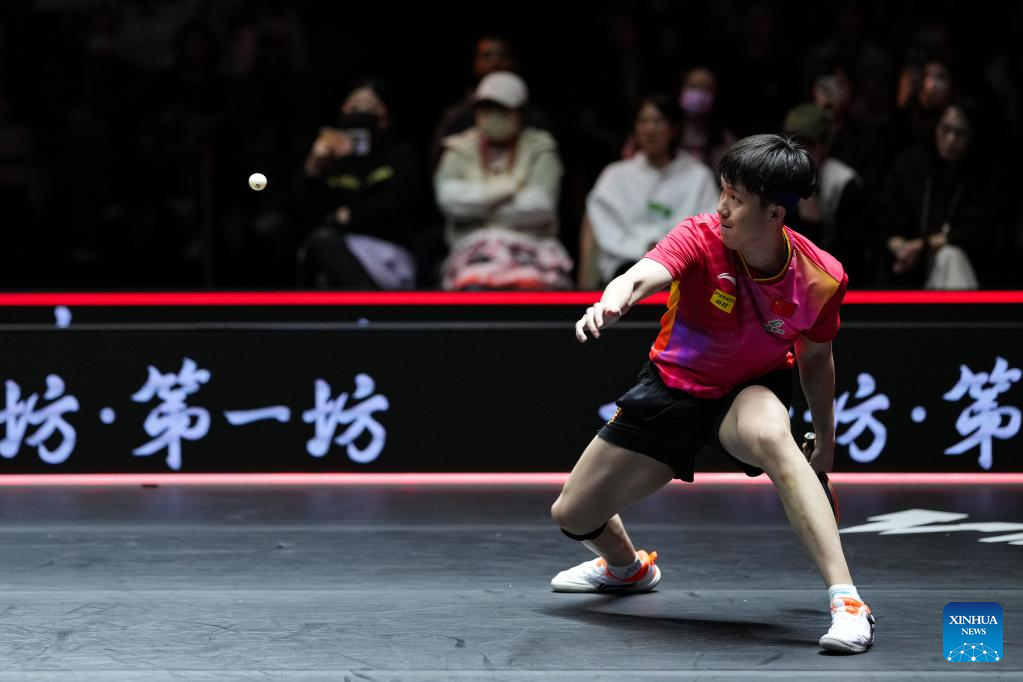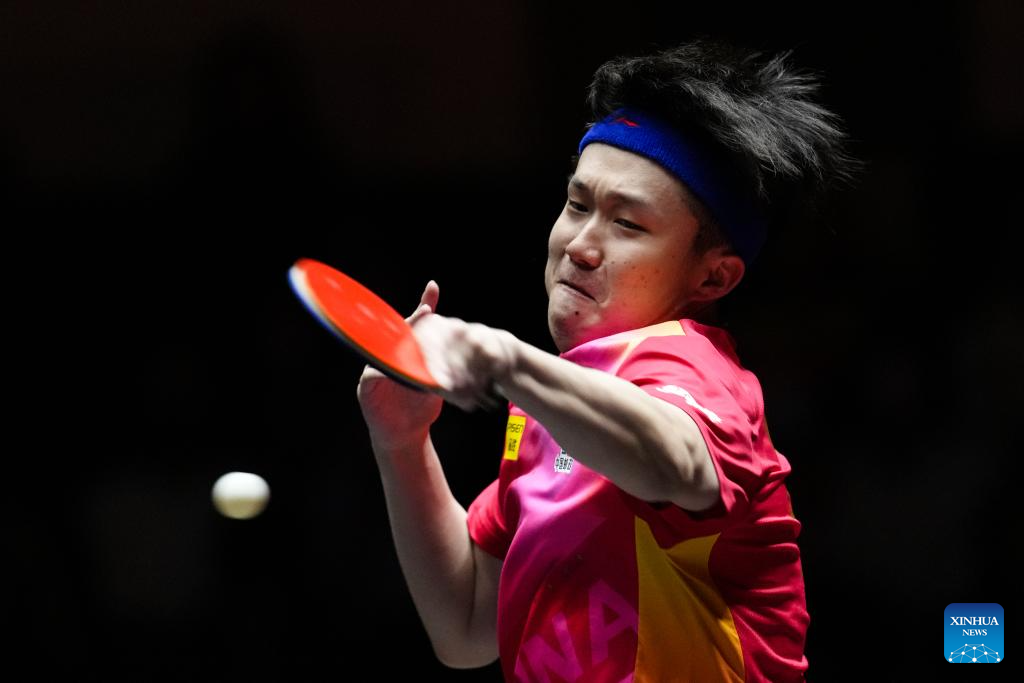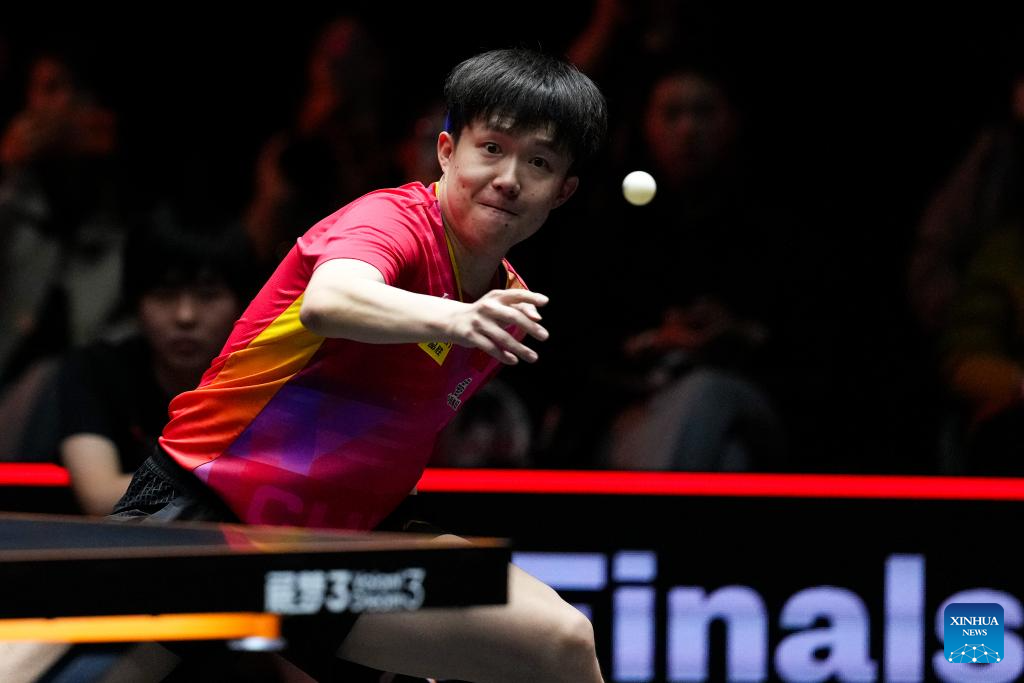Wang Chuqin hits a return during the men's singles quarterfinal match between Wang Chuqin of China and Truls Moregard of Sweden at World Table Tennis (WTT) Finals Fukuoka 2024 in Kitakyushu, Japan, on Nov. 22, 2024. (Xinhua/Zhang Xiaoyu)