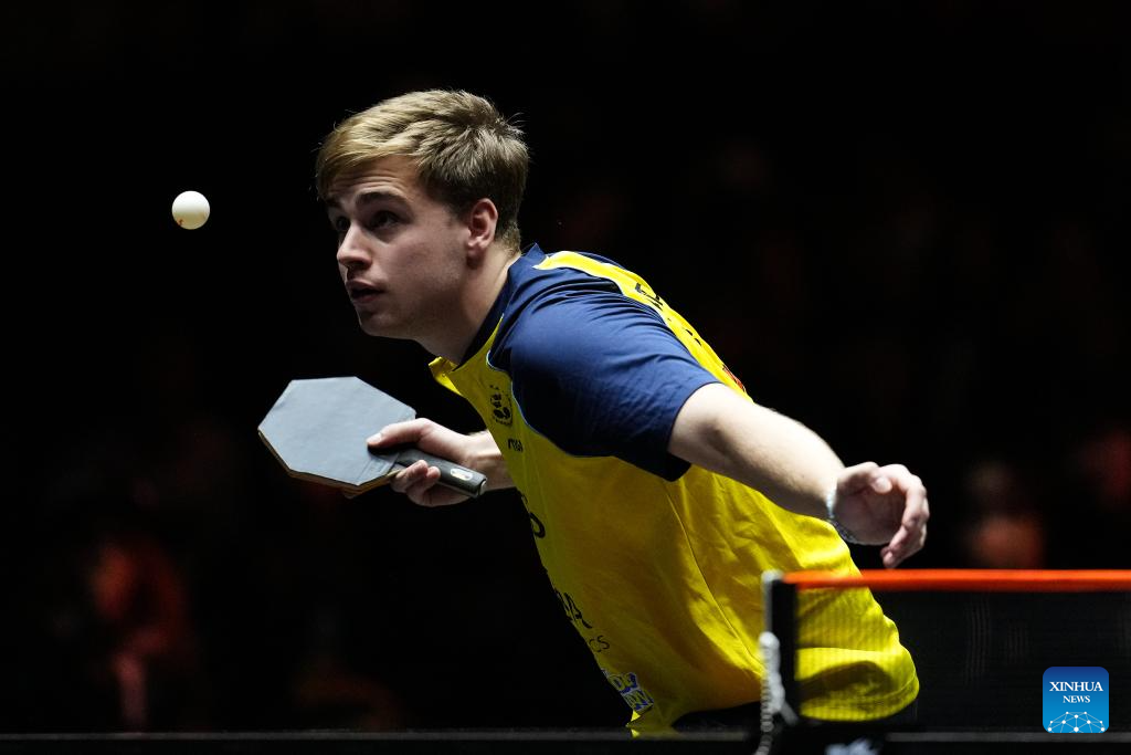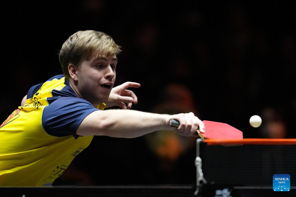 Truls Moregard hits a return during the men's singles quarterfinal match between Wang Chuqin of China and Truls Moregard of Sweden at World Table Tennis (WTT) Finals Fukuoka 2024 in Kitakyushu, Japan, on Nov. 22, 2024. (Xinhua/Zhang Xiaoyu)