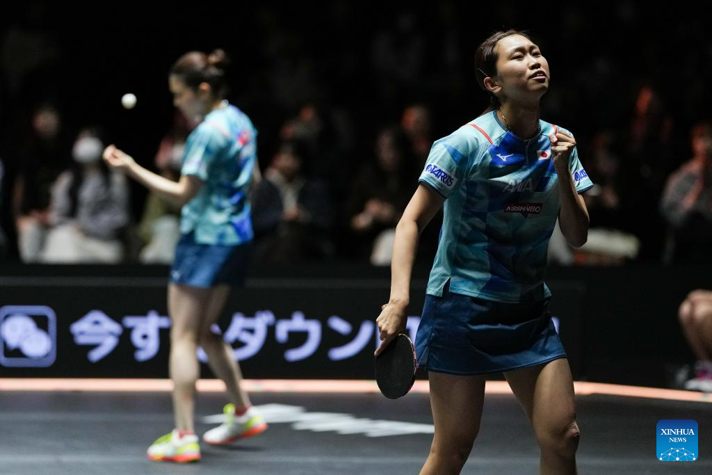 Sato Hitomi (R)/Hashimoto Honoka of Japan compete during the women's doubles semifinal between Qian Tianyi/Chen Xingtong of China and Sato Hitomi/Hashimoto Honoka of Japan at World Table Tennis (WTT) Finals Fukuoka 2024 in Kitakyushu, Japan, Nov. 22, 2024. (Xinhua/Zhang Xiaoyu)