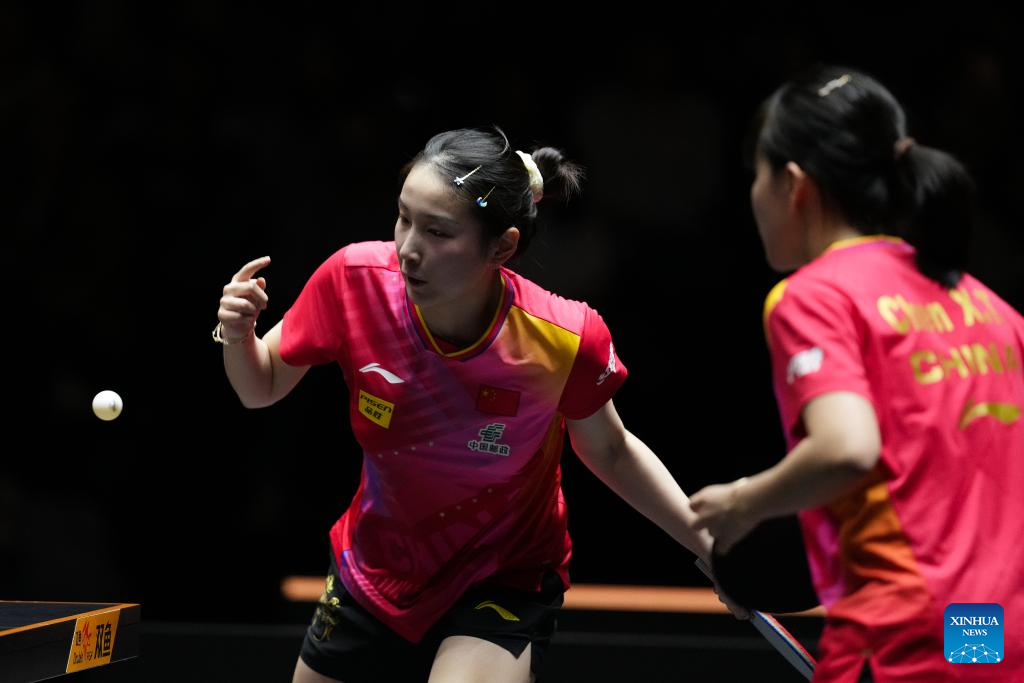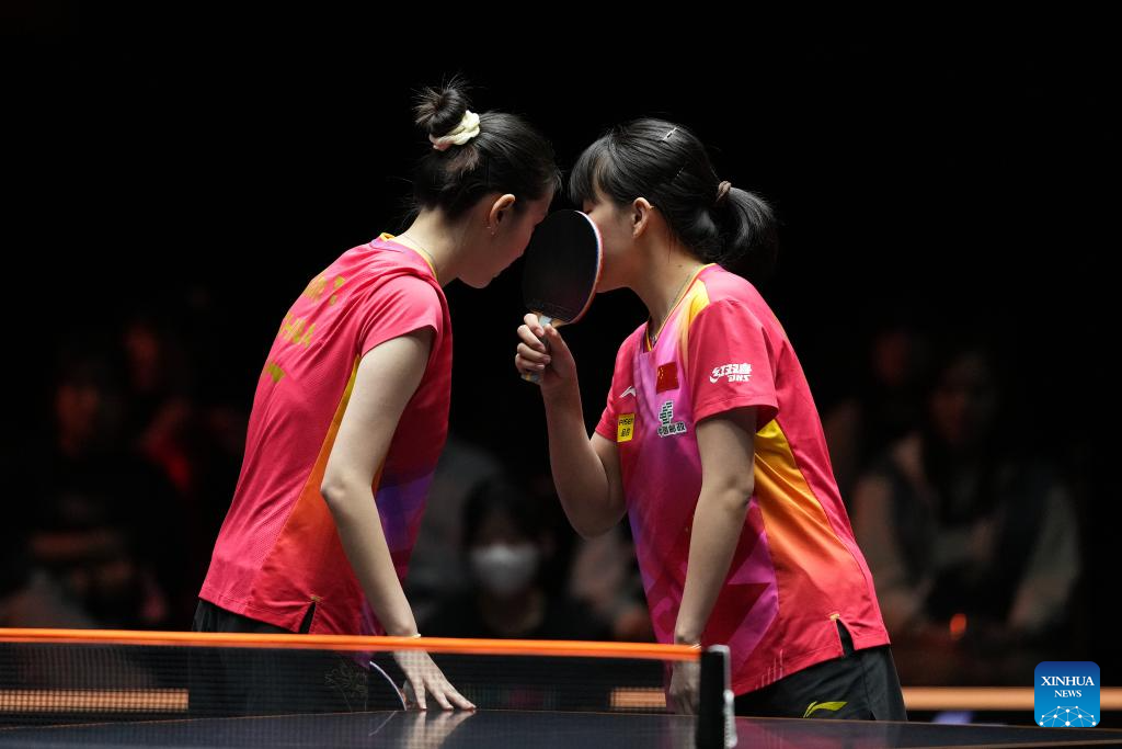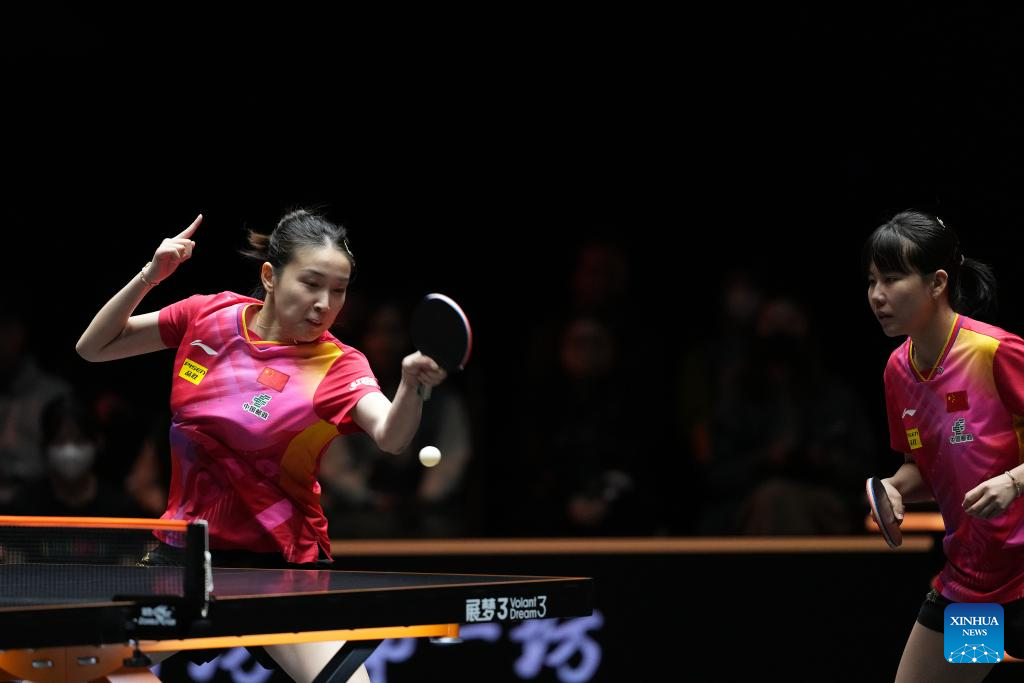 Qian Tianyi (L)/Chen Xingtong of China compete during the women's doubles semifinal between Qian Tianyi/Chen Xingtong of China and Sato Hitomi/Hashimoto Honoka of Japan at World Table Tennis (WTT) Finals Fukuoka 2024 in Kitakyushu, Japan, Nov. 22, 2024. (Xinhua/Zhang Xiaoyu)