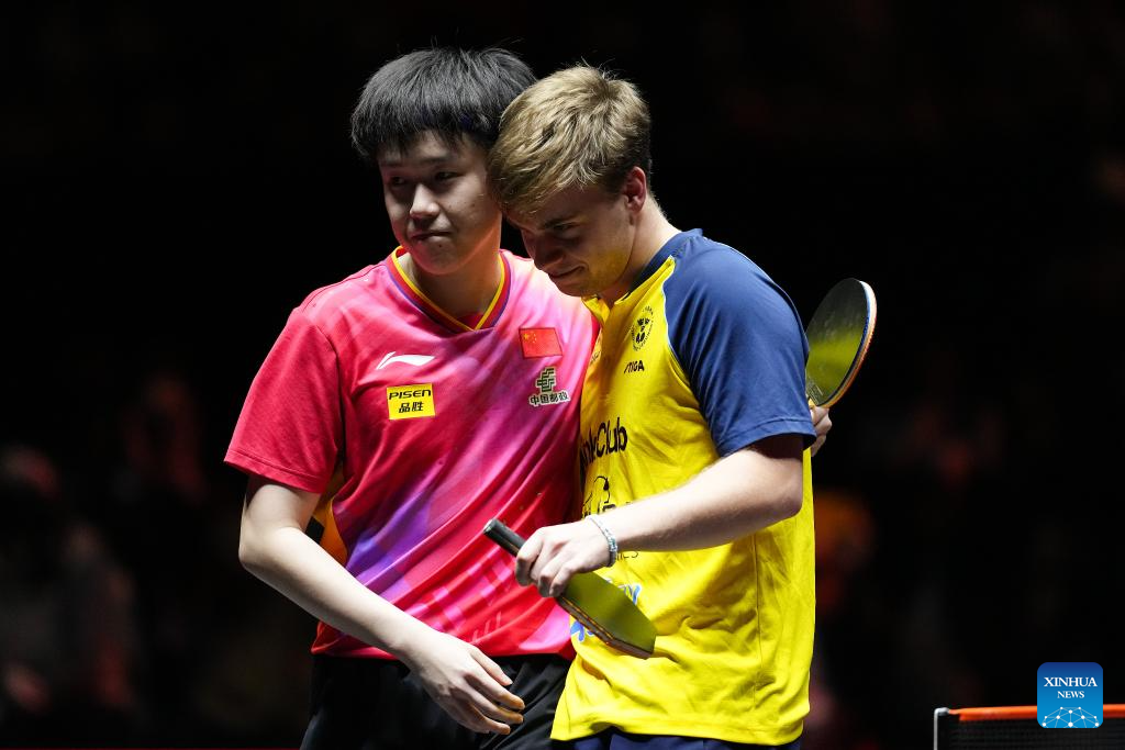 Wang Chuqin (L) greets Truls Moregard after the men's singles quarterfinal match between Wang Chuqin of China and Truls Moregard of Sweden at World Table Tennis (WTT) Finals Fukuoka 2024 in Kitakyushu, Japan, on Nov. 22, 2024. (Xinhua/Zhang Xiaoyu)