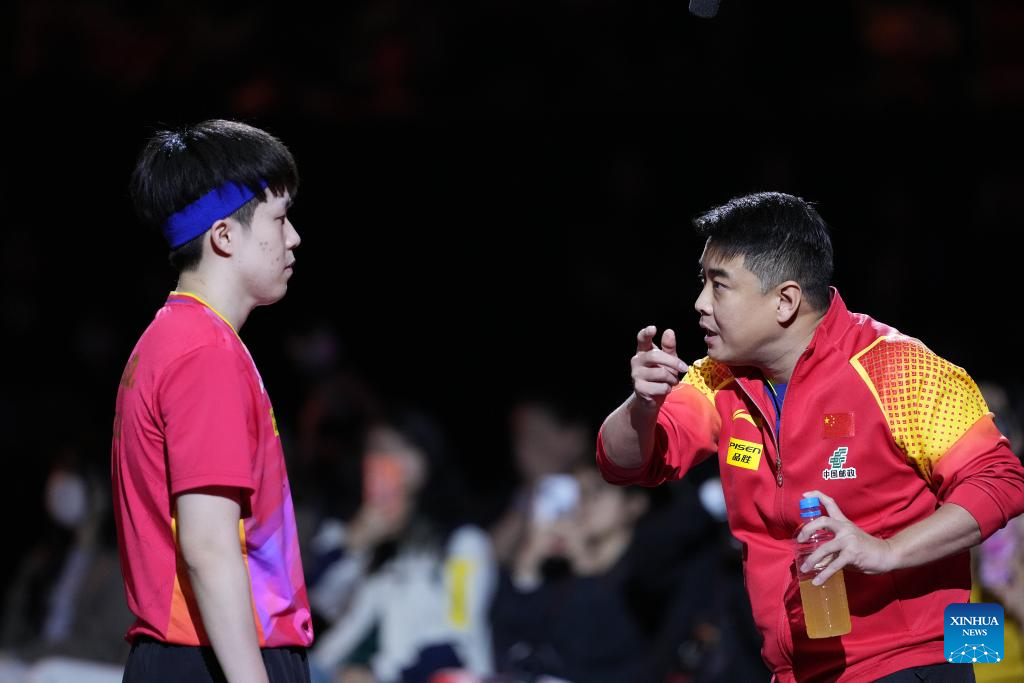Coach Wang Hao (R) instrucs Wang Chuqin during the men's singles quarterfinal match between Wang Chuqin of China and Truls Moregard of Sweden at World Table Tennis (WTT) Finals Fukuoka 2024 in Kitakyushu, Japan, on Nov. 22, 2024. (Xinhua/Zhang Xiaoyu)