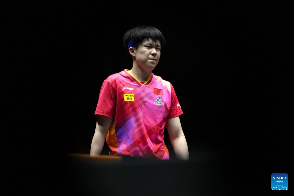 Wang Chuqin reacts during the men's singles quarterfinal match between Wang Chuqin of China and Truls Moregard of Sweden at World Table Tennis (WTT) Finals Fukuoka 2024 in Kitakyushu, Japan, on Nov. 22, 2024. (Xinhua/Zhang Xiaoyu)