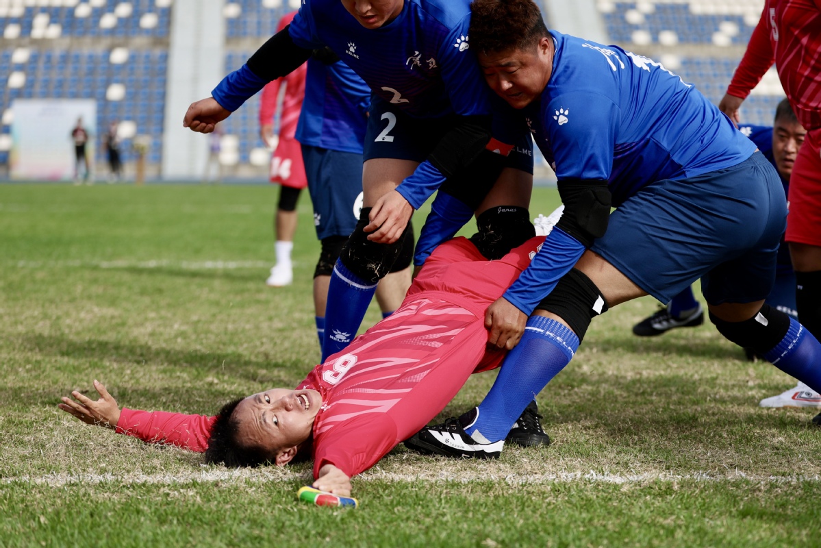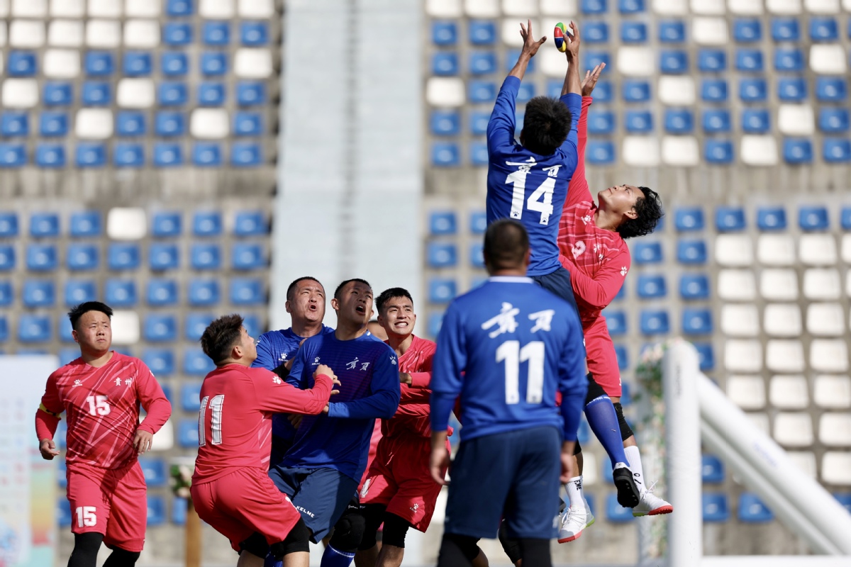 Huapao, a traditional Chinese rugby-like sport is played between teams from Xizang autonomous region (red) and Hebei at the 12th National Traditional Games of Ethnic Minorities of the People's Republic of China on Saturday in South China's Hainan province. The Hebei team lost at 1:3. (Photo by Wei Xiaohao/chinadaily.com.cn)
