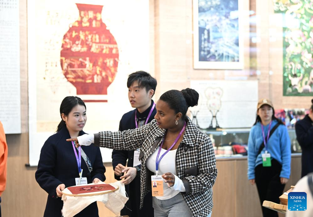 Kalkidan tries traditional Chinese embroidery at the 2024 World Vocational and Technical Education Development Conference in Tianjin, north China, Nov. 22, 2024. (Xinhua/Li Ran)