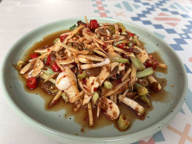 Then there's the pickled sour taro stalks—a dish made from seemingly ordinary taro stalks. Washed, chopped, and mixed with chili, Sichuan peppercorns, and sugar, the taro stalks are left to ferment in jars. The result is a tangy side dish perfect for stimulating the appetite.