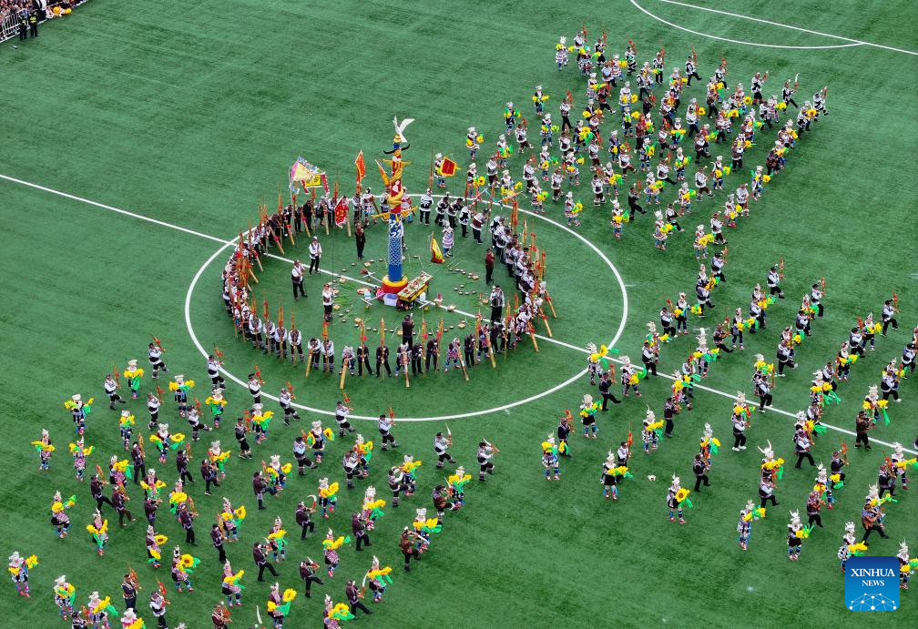 An aerial drone photo shows people in traditional costumes participating in Lusheng and horse fighting festival held in Rongshui Miao Autonomous County of Liuzhou, south China's Guangxi Zhuang Autonomous Region, Nov. 23, 2024. Lusheng is a folk musical instrument made of bamboo pipes. (Photo by Zheng Changhao/Xinhua)