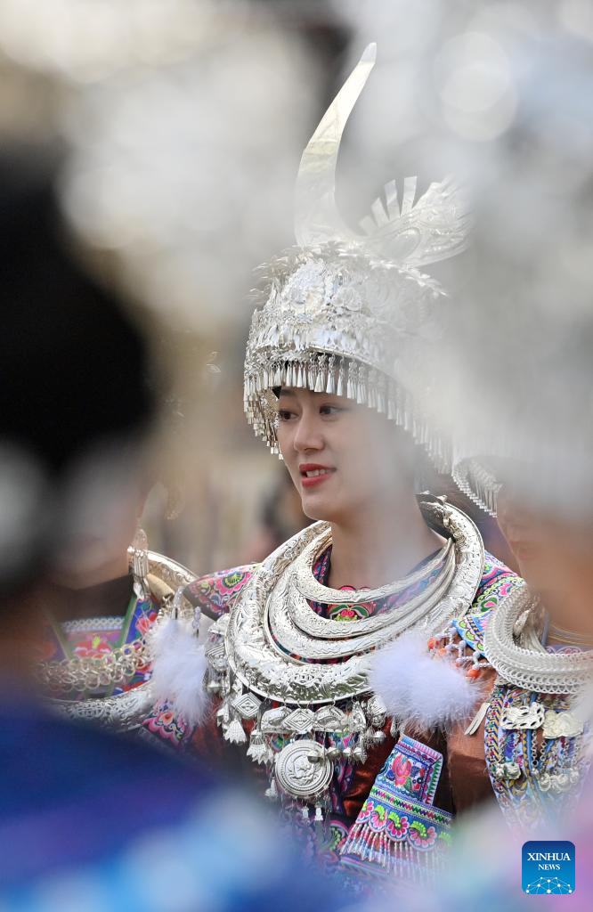 People in traditional costumes participate in Lusheng and horse fighting festival held in Rongshui Miao Autonomous County of Liuzhou, south China's Guangxi Zhuang Autonomous Region, Nov. 23, 2024. Lusheng is a folk musical instrument made of bamboo pipes. (Xinhua/Huang Xiaobang)