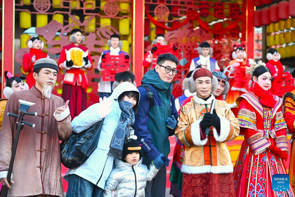 Tourists pose for photos with performers at an immersive performing arts town in Xixia District of Yinchuan, northwest China's Ningxia Hui Autonomous Region, Nov. 25, 2024.