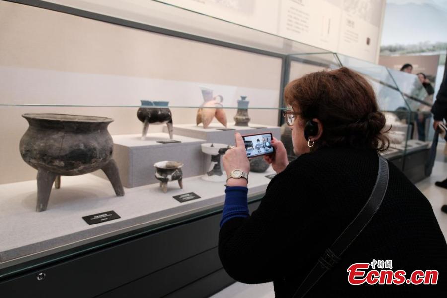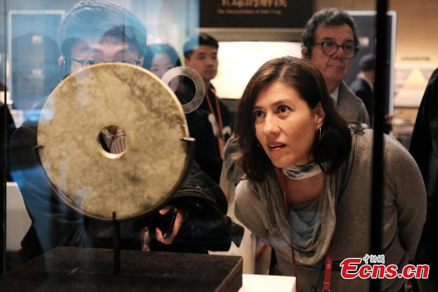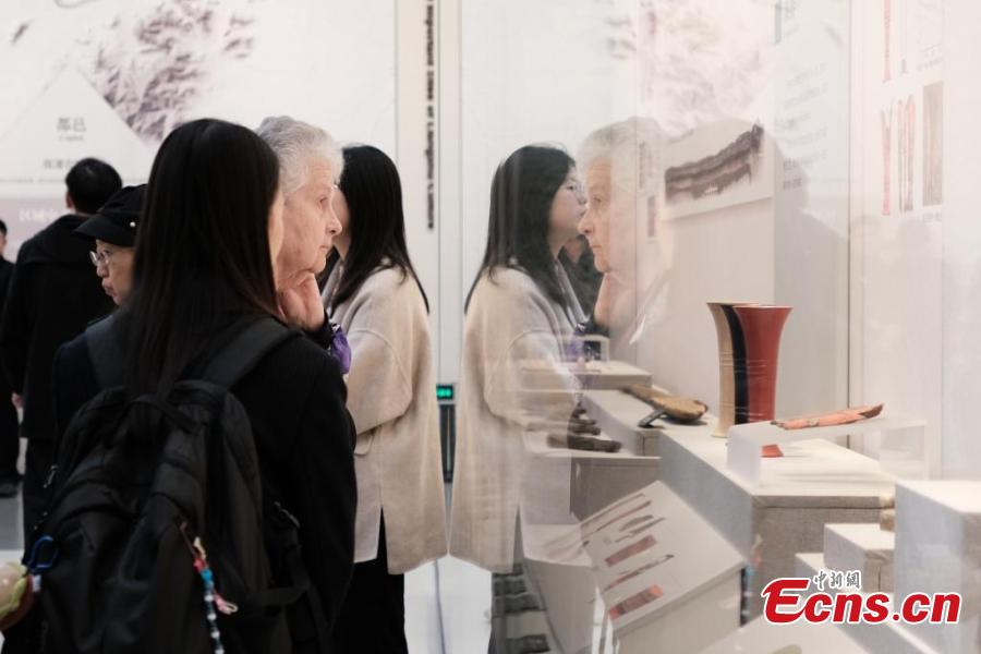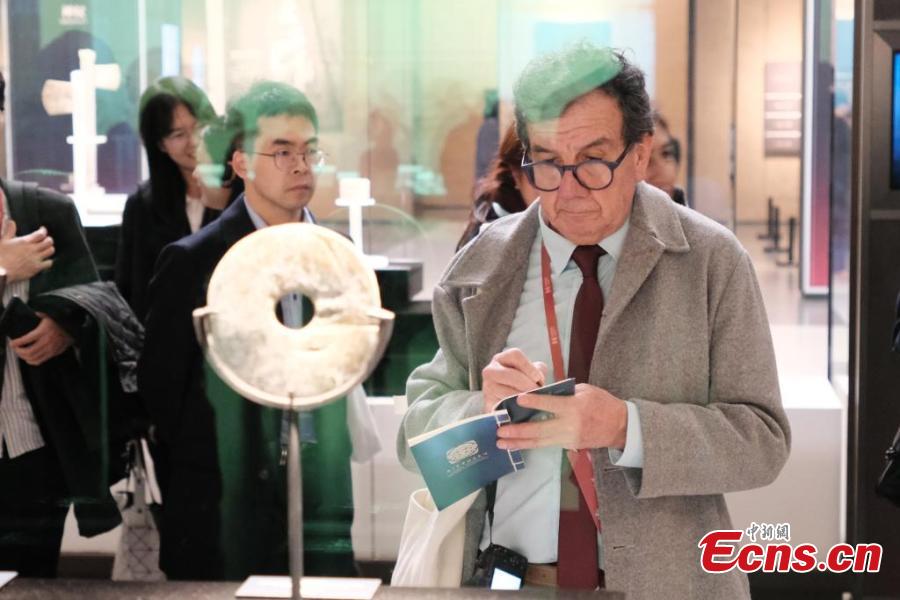 Archaeologists view cultural relics discovered from Liangzhu ruins at the Liangzhu Museum in Hangzhou, east China's Zhejiang Province, Nov. 25, 2024. (Photo: China News Service/Cao Dan)