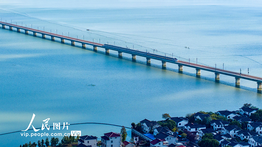 A trial operation train of the Shanghai-Suzhou-Huzhou high-speed railway crosses Yuandang Lake in Wujiang district, Suzhou, southeast China's Jiangsu Province, Nov. 23, 2024. (Photo/Yuan Xinyu)