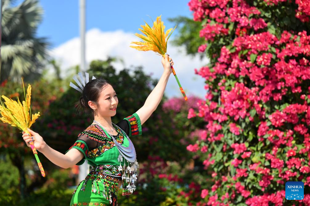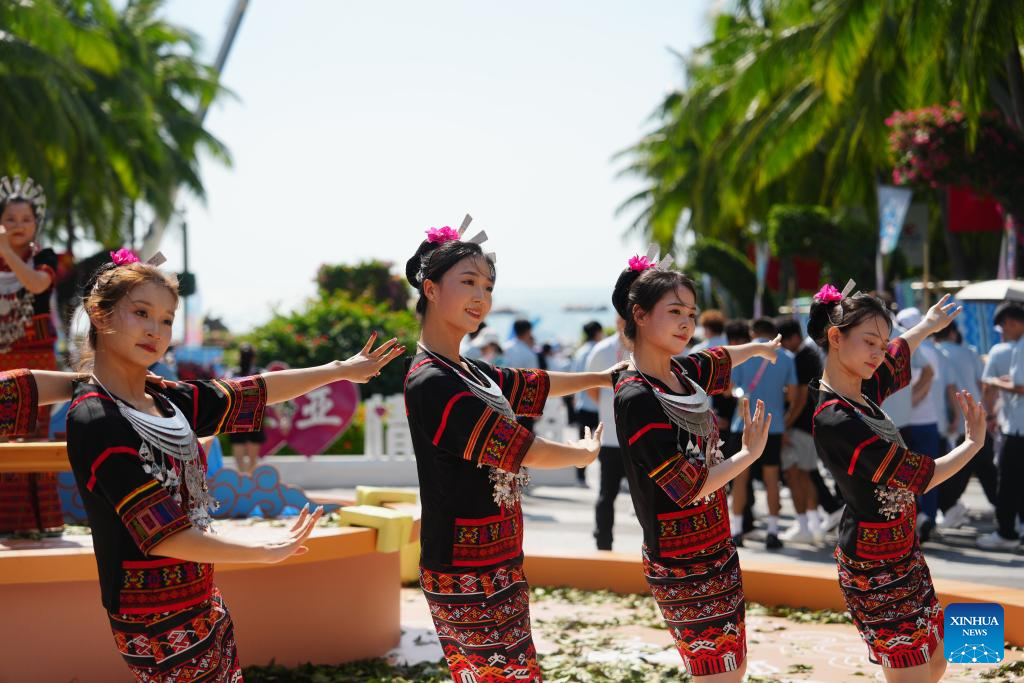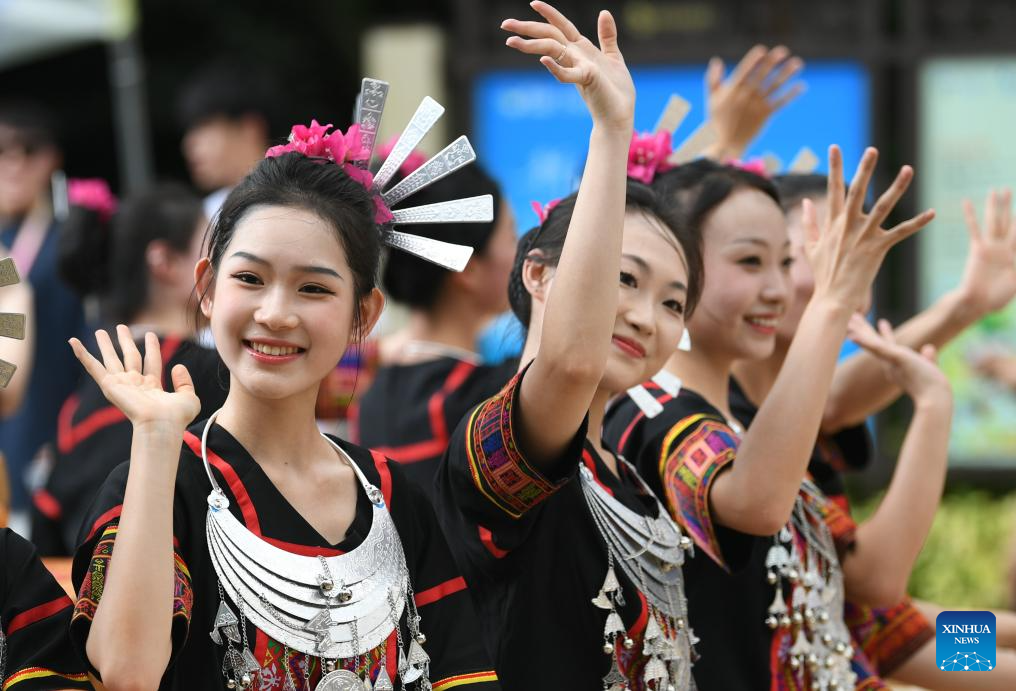 Artists welcome guests during a performance gala of the 12th National Traditional Games of Ethnic Minorities of China in Sanya, south China's Hainan Province, Nov. 26, 2024. (Xinhua/Yang Wenbin)