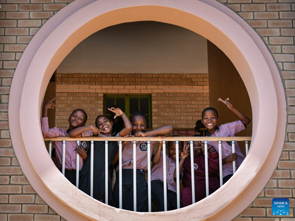 Students take a break between classes at China-aided Mmopane Primary School in Mmopane, Kweneng District, Botswana, Nov. 4, 2024. Mmopane Primary School, which opened in 2021, is one of the four primary schools in Botswana built with a grant from the Chinese government, the other three being Kubung Primary School, Dinokwane Primary School, and Ramaeba Primary School. These China-aided schools feature computer labs, science labs, libraries, dining halls, disability-friendly facilities, and football and basketball fields. (Xinhua/Han Xu)