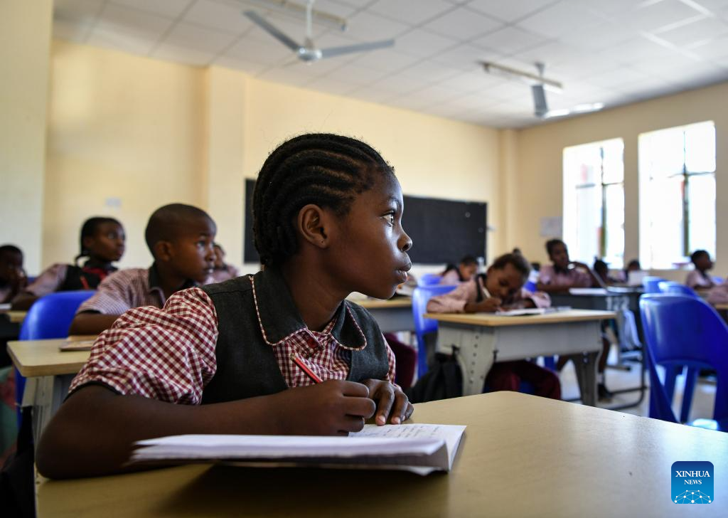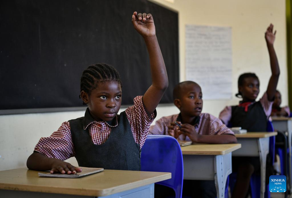 Pradence Tshepi (L) attends a class at China-aided Mmopane Primary School in Mmopane, Kweneng District, Botswana, Nov. 4, 2024. Mmopane Primary School, which opened in 2021, is one of the four primary schools in Botswana built with a grant from the Chinese government, the other three being Kubung Primary School, Dinokwane Primary School, and Ramaeba Primary School. These China-aided schools feature computer labs, science labs, libraries, dining halls, disability-friendly facilities, and football and basketball fields. (Xinhua/Han Xu)