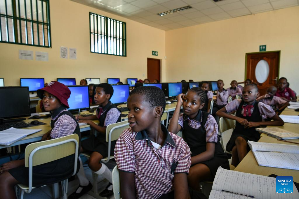 Students take a computer class at China-aided Mmopane Primary School in Mmopane, Kweneng District, Botswana, Nov. 4, 2024. Mmopane Primary School, which opened in 2021, is one of the four primary schools in Botswana built with a grant from the Chinese government, the other three being Kubung Primary School, Dinokwane Primary School, and Ramaeba Primary School. These China-aided schools feature computer labs, science labs, libraries, dining halls, disability-friendly facilities, and football and basketball fields. (Xinhua/Han Xu)