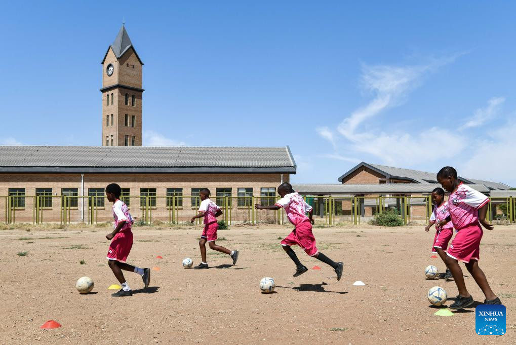 Students play football at China-aided Mmopane Primary School in Mmopane, Kweneng District, Botswana, Nov. 4, 2024. Mmopane Primary School, which opened in 2021, is one of the four primary schools in Botswana built with a grant from the Chinese government, the other three being Kubung Primary School, Dinokwane Primary School, and Ramaeba Primary School. These China-aided schools feature computer labs, science labs, libraries, dining halls, disability-friendly facilities, and football and basketball fields. (Xinhua/Han Xu)