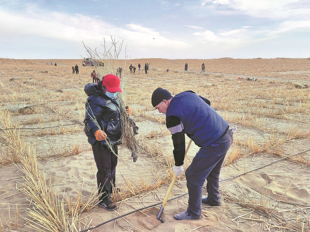 Residents plant oleaster trees in Minfeng county, Xinjiang Uygur autonomous region, on Thursday. The county is located on the southern edge of the Taklimakan Desert. (MAO WEIHUA/CHINA DAILY)