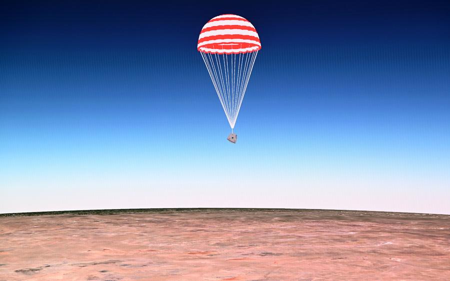 This image taken from video animation at Beijing Aerospace Control Center on June 25, 2024 shows the returner of the Chang'e-6 probe landing on Earth. (Xinhua/Jin Liangkuai)