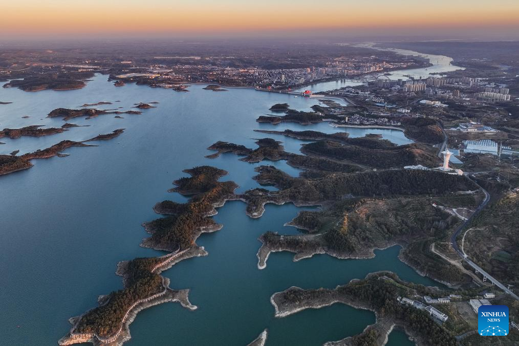 An aerial drone photo taken on Nov. 29, 2024 shows a view of the Danjiangkou Reservoir in central China's Hubei Province. (Xinhua/Hu Jingwen)