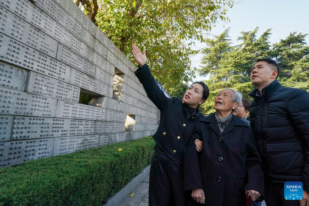 Nanjing Massacre survivors Ai Yiying (2nd R) searches for the names of her relatives, the victims of the Nanjing Massacre, in front of the "wailing wall" outside the Memorial Hall of the Victims in Nanjing Massacre by Japanese Invaders, in Nanjing, east China's Jiangsu Province, Dec. 1, 2024.(Xinhua/Li Bo)