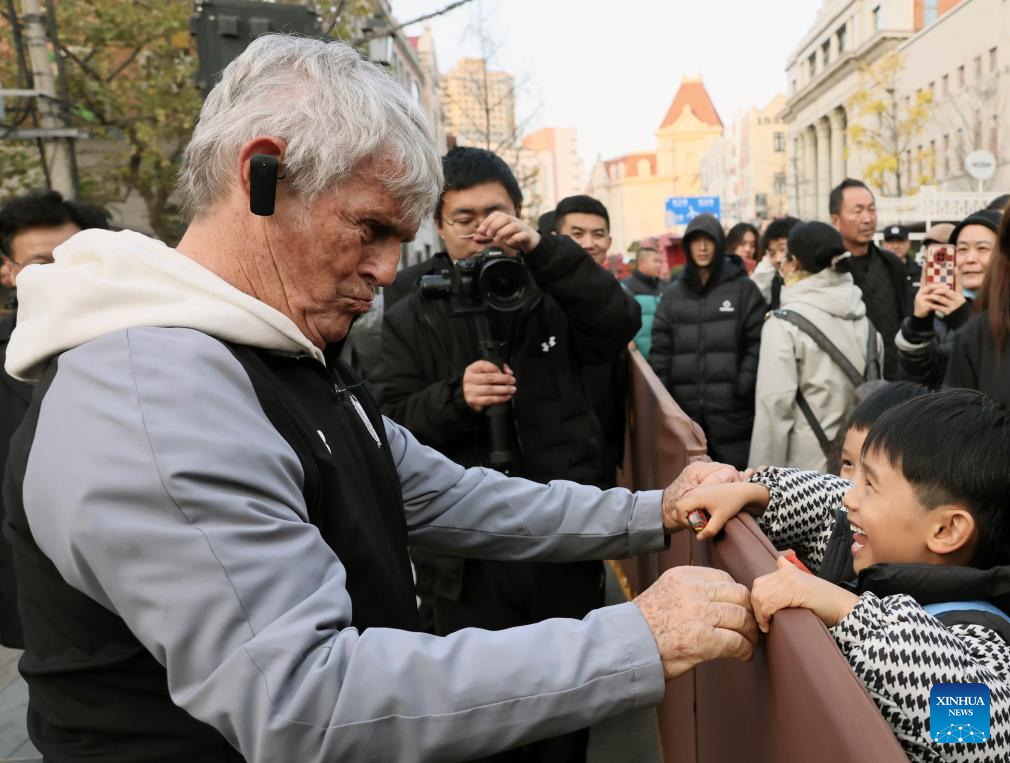 Former Chinese national team coach Bora Milutinovic (front L) interacts with children during a football charity event in Qingdao, east China's Shandong Province, Nov. 30, 2024. (Photo by Lan Hongguang/Xinhua)