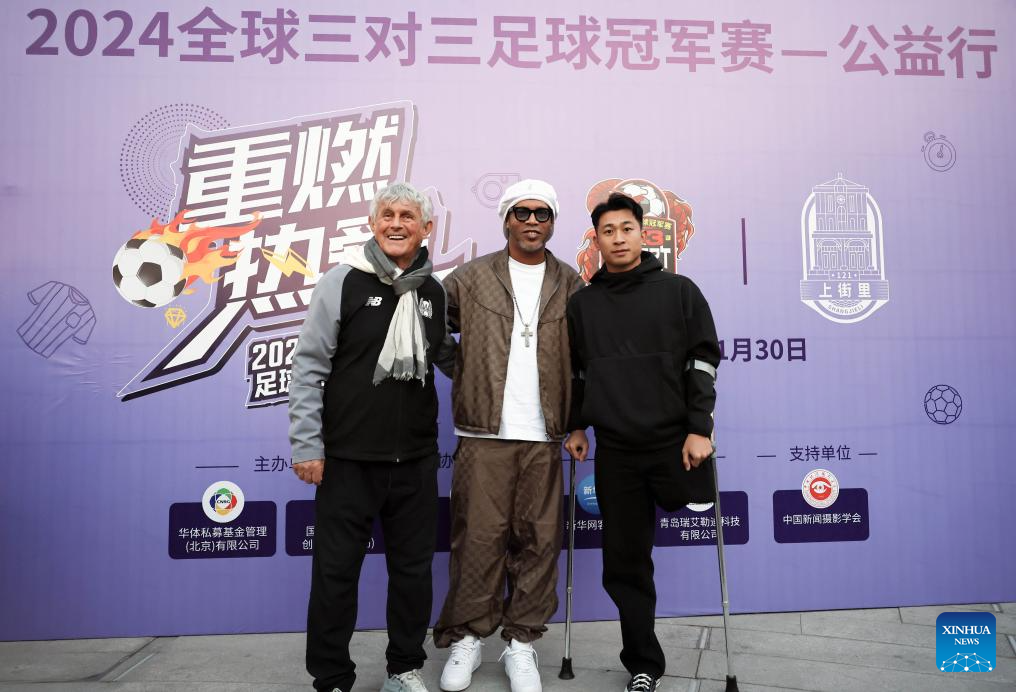 Former Chinese national team coach Bora Milutinovic, former Brazilian national team football player Ronaldinho, Chinese para-athlete He Yiyi (from L to R) pose for photos during a football charity event in Qingdao, east China's Shandong Province, Nov. 30, 2024. (Photo by Lan Hongguang/Xinhua)
