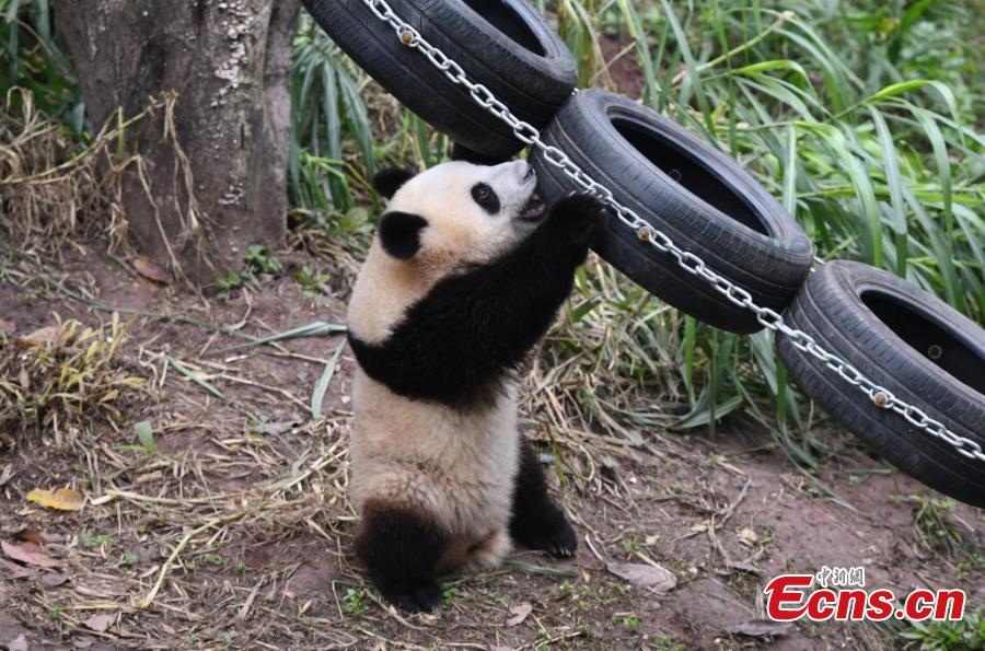 Giant panda Mang Cancan plays outdoor at Chongqing Zoo, Dec. 1, 2024. (Photo: China News Service/Zhou Yi)