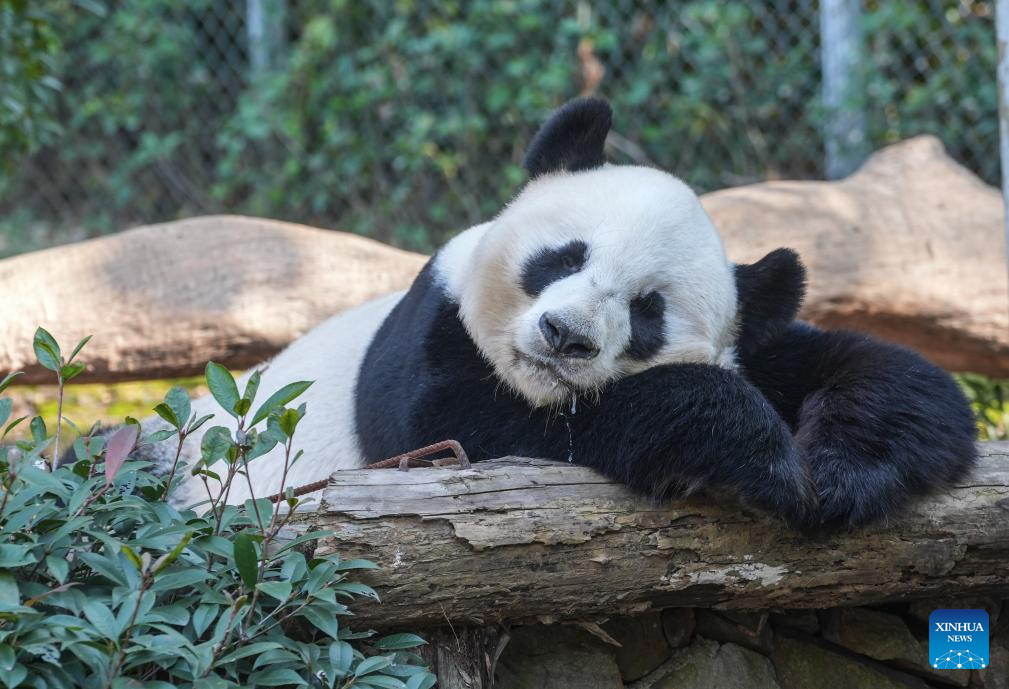 Giant panda Fu Hu slobbers while napping at a wildlife zoo in Tangshan tourist resort in Nanjing, east China's Jiangsu Province, Dec. 1, 2024. Seven giant pandas, all of them guests from the China Conservation and Research Center for Giant Pandas, have attracted thousands of eyes as they enjoyed food and sunshine in public on a warm winter day. (Xinhua/Yang Lei)