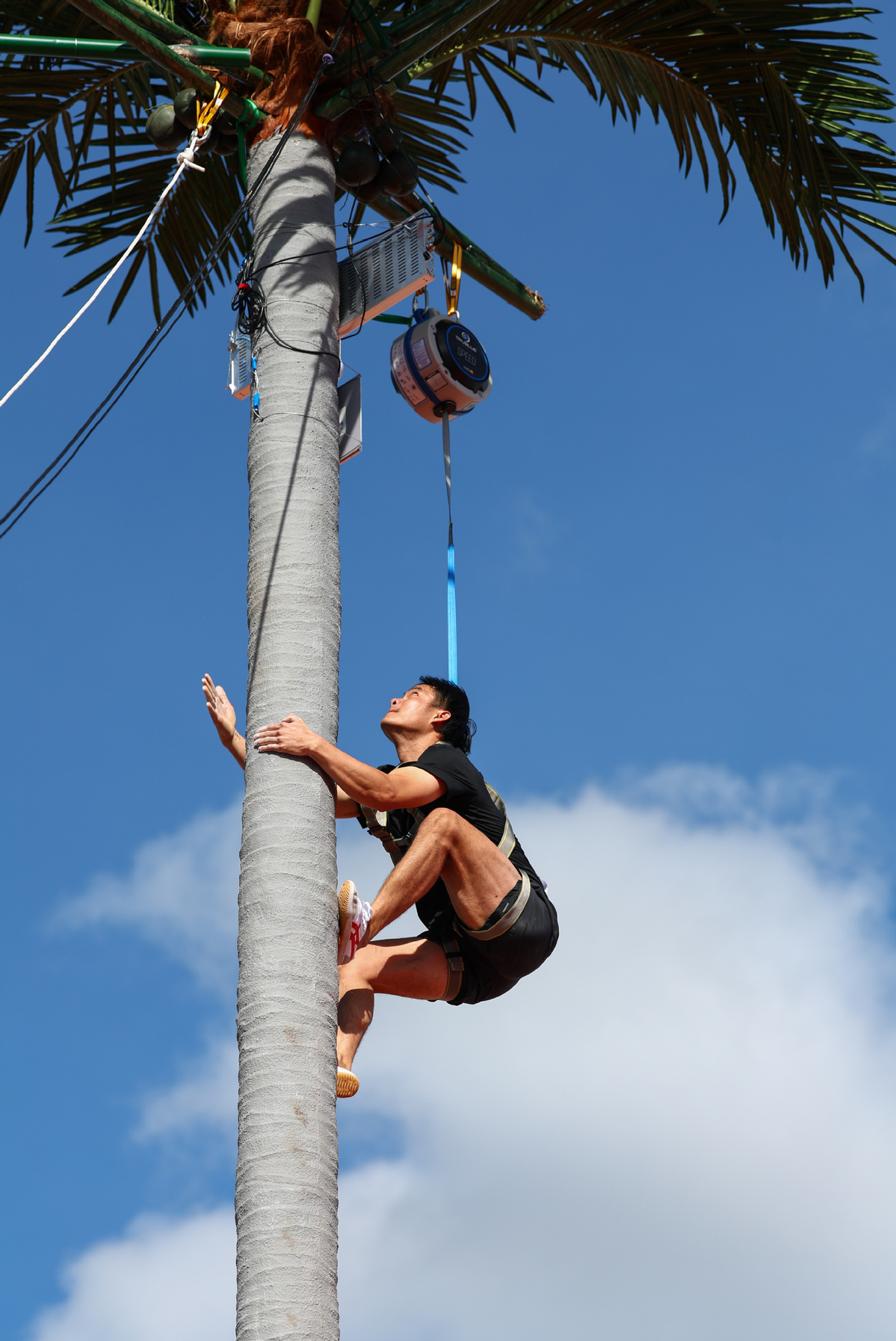 An athlete climbs coconut trees during a race at the 12th National Traditional Games of Ethnic Minorities of the People's Republic of China on Nov 24, 2024, in Sanya, South China's Hainan province. The sport is both fun and competitive, originating from the labor scene of local people. (Photo/Xinhua)